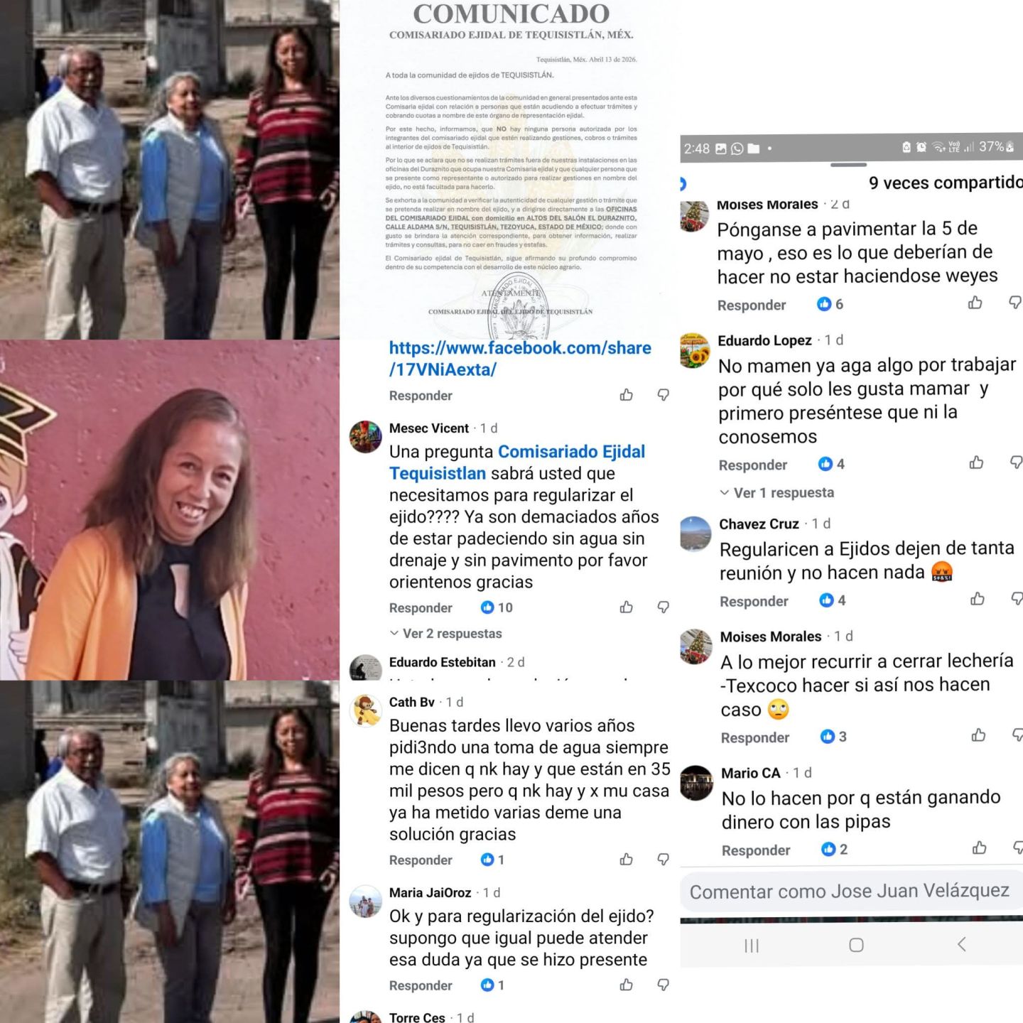 Cientos de personas se queja del mala trabajo de los ejidatarios de Tequisistlán Tezoyuca sobre la su mala gestión de los integrantes del comité ejidal Noé Capistrán, Rosario (tesorera) y Anayatzin Peralta (presidenta). Los señalamientos principales son:
