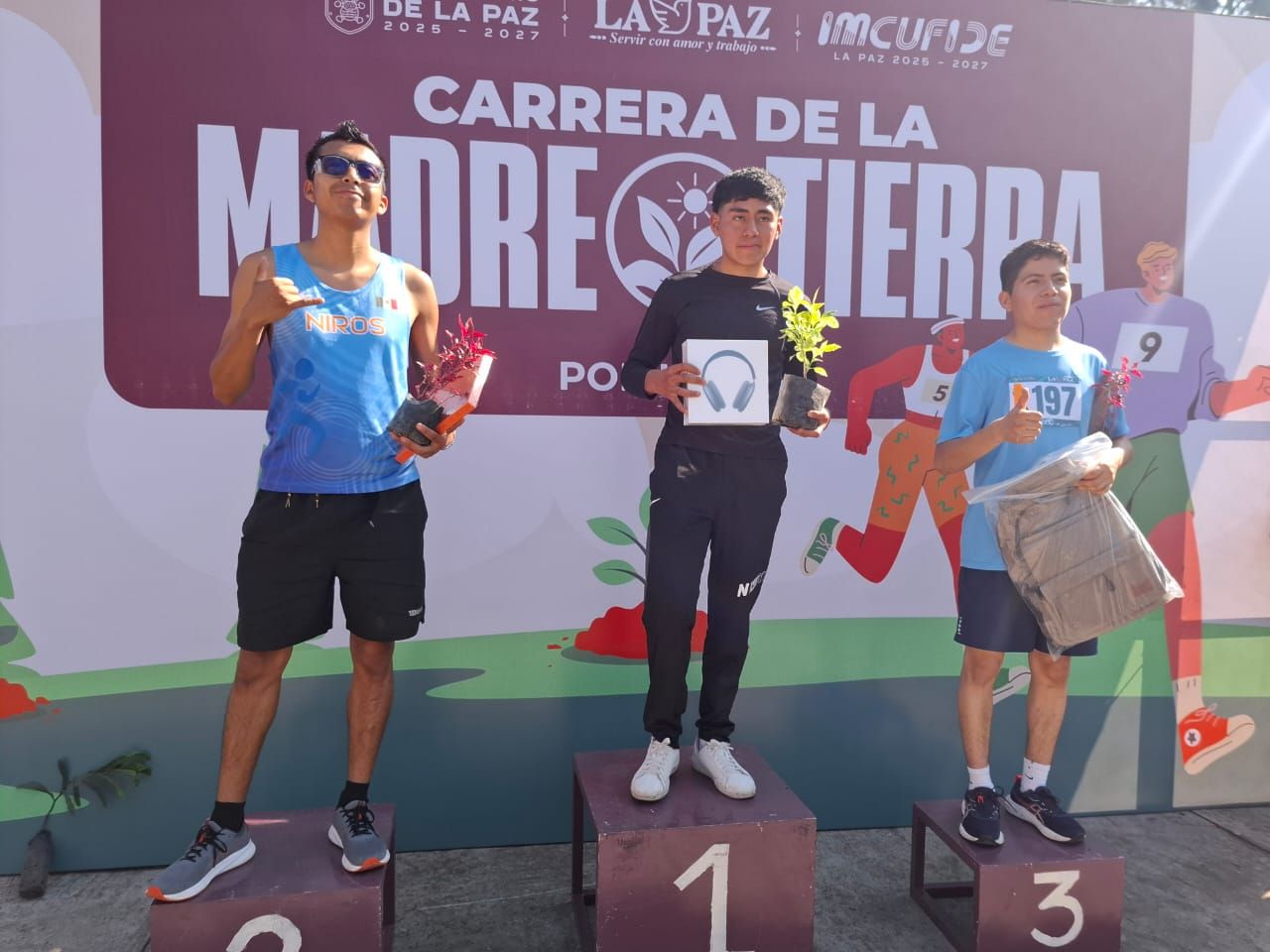 Al encabezar la premiación a los ganadores de la Carrera de la Madre Tierra por La Paz, la Primera Regidora y el director del IMCUFIDE, Antonio Villanueva González, coincidieron en señalar que, con este tipo de actividades deportivas y ambientales, el Gobierno Municipal busca unir a los ciudadanos, sobre todo, en los espacios deportivos y recreativos recuperados por la administración.